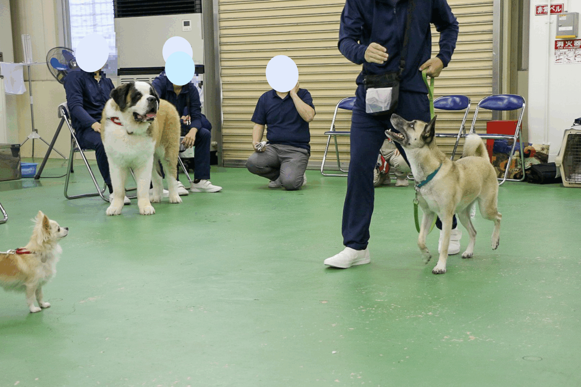 ヒールの練習では犬を横につけさせたまま、前回から距離を伸ばし、部屋の中を歩く練習をしました。他人のトレーニング風景もみて勉強できるよう、一人ずつ全員の前で歩きます。他の人がどうやっているのかをみることも、勉強の一つです。どんなところが上手にできていて、どんなところの練習が必要か、見ながら学べることも多くあります。終えた人に拍手をし、賞賛するという雰囲気も自然とでてきていました。