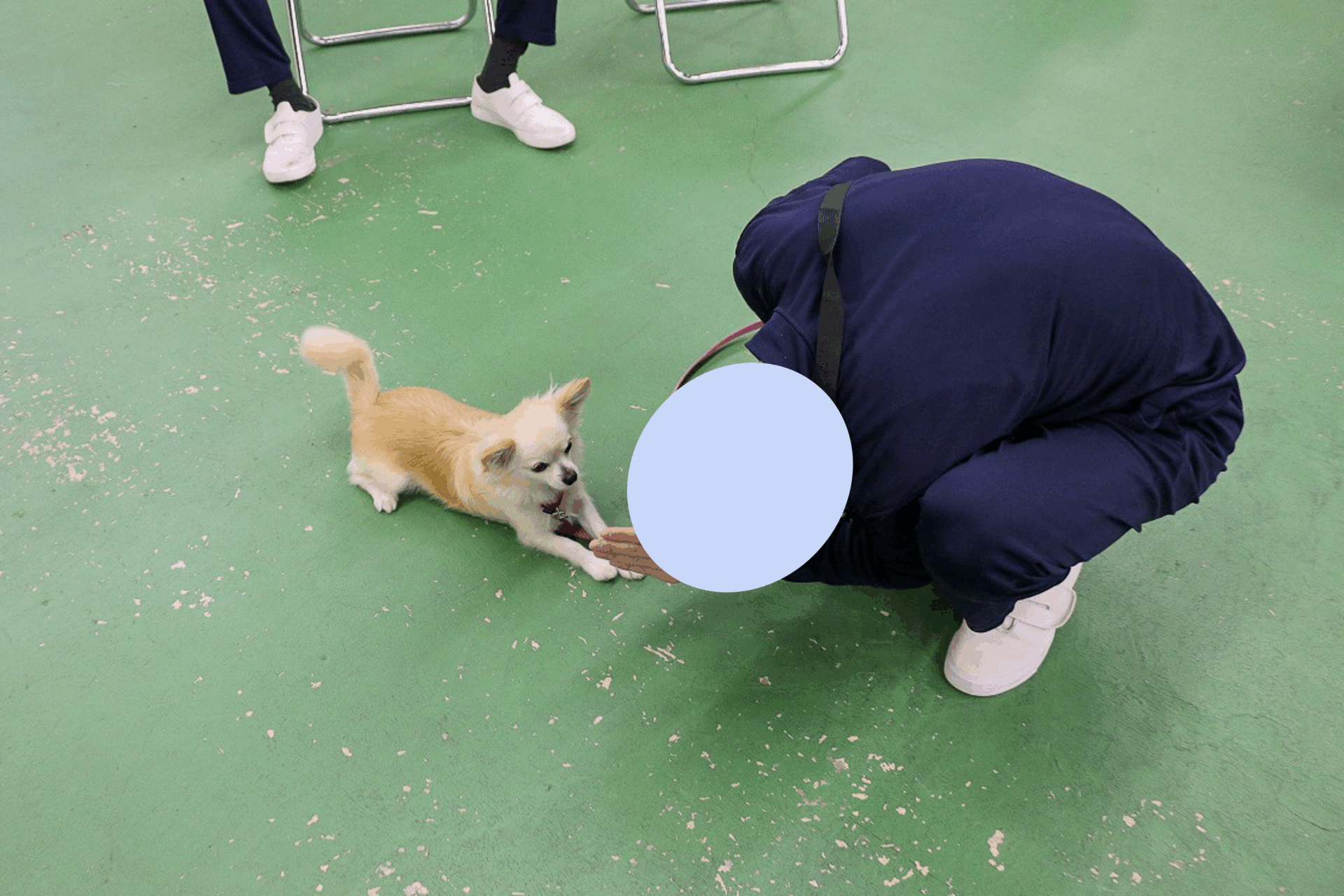 トレーニングを終え、最後は保護犬たちとリラックスしながらふれあいタイムです。きこちゃんもふれあいに参加するため、ハウスを開けると、ゆっくりそろーりと出てきました。受刑者たちもきこちゃんの登場に嬉しそうな表情です。ある受刑者は、声色が変わり、優しい口調できこちゃんに話しかけていました。適度に距離を保ちつつも、きこちゃんとふれあいをしたい様子。最終的に、きこちゃんをお膝の上に乗せて、コミュニケーションを図っていました。「慣れない場所は怖いよね〜」ときこちゃんの気持ちに寄り添う言葉をかけている受刑者もいました。相変わらずおやつを食べられないきこちゃん。ですが、しっかりとおやつの匂いをチェックしていました。次回の訪問では、受刑者からもらうおやつを食べられるでしょうか。