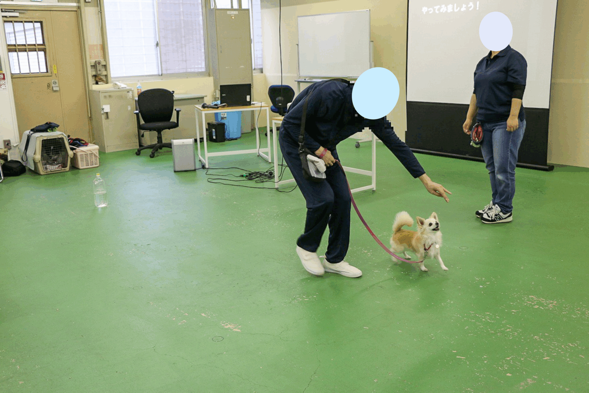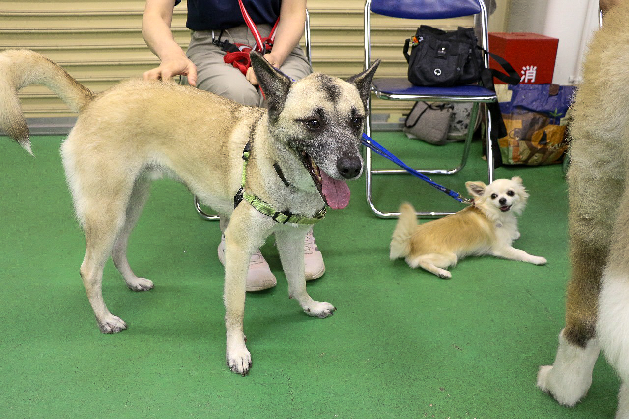 ヒールの練習では犬を横につけさせたまま、前回から距離を伸ばし、部屋の中を歩く練習をしました。他人のトレーニング風景もみて勉強できるよう、一人ずつ全員の前で歩きます。他の人がどうやっているのかをみることも、勉強の一つです。どんなところが上手にできていて、どんなところの練習が必要か、見ながら学べることも多くあります。終えた人に拍手をし、賞賛するという雰囲気も自然とでてきていました。