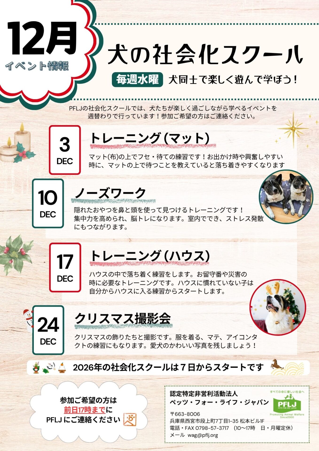 12月も犬たちが楽しく過ごせるイベントを予定しています!参加ご希望の方はご連絡ください。